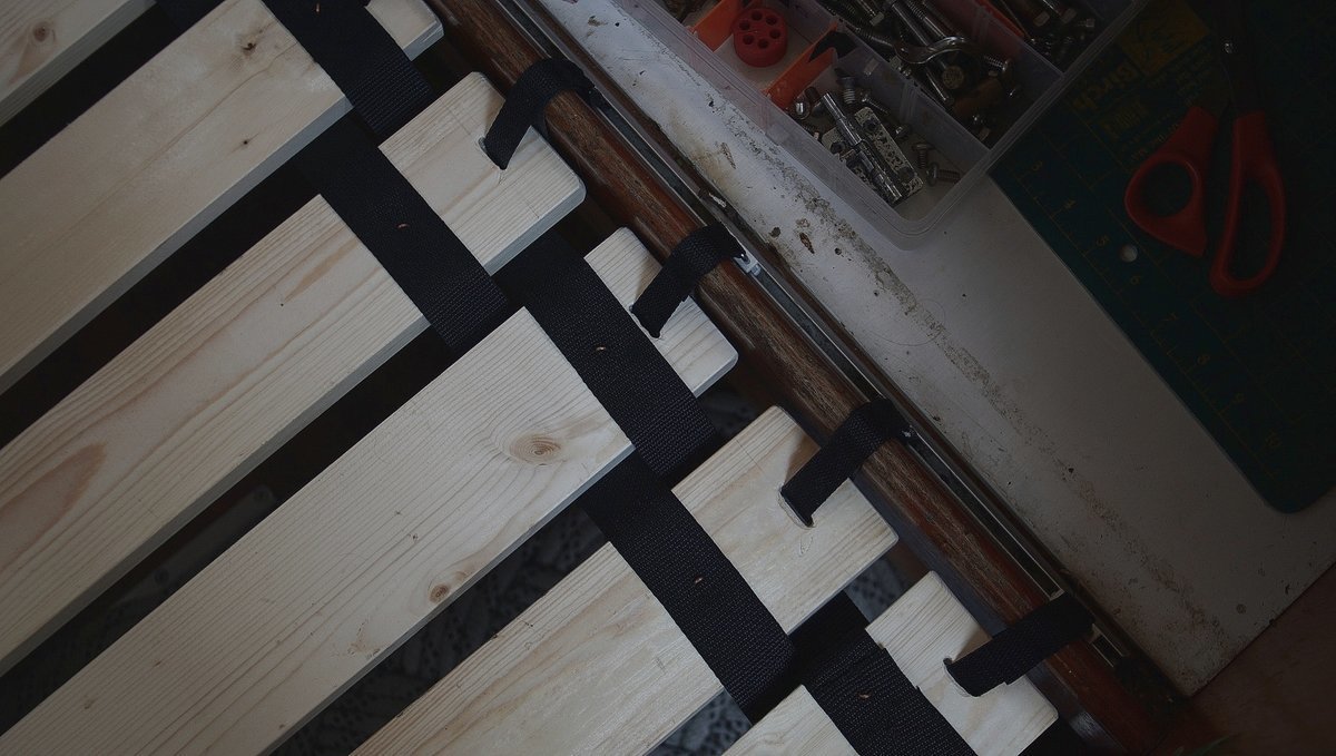 Of course, we measured the length of the webbing to ensure that all loops are even so that the bed sits straight. We also used some SS slides we ordered for our mainsail in 2019, we couldn't use them in the mast finally because we feared that they would bite into the aluminum of the mast too much. Now, we're using them for the bed slats. A bit overkill, but also fine :).