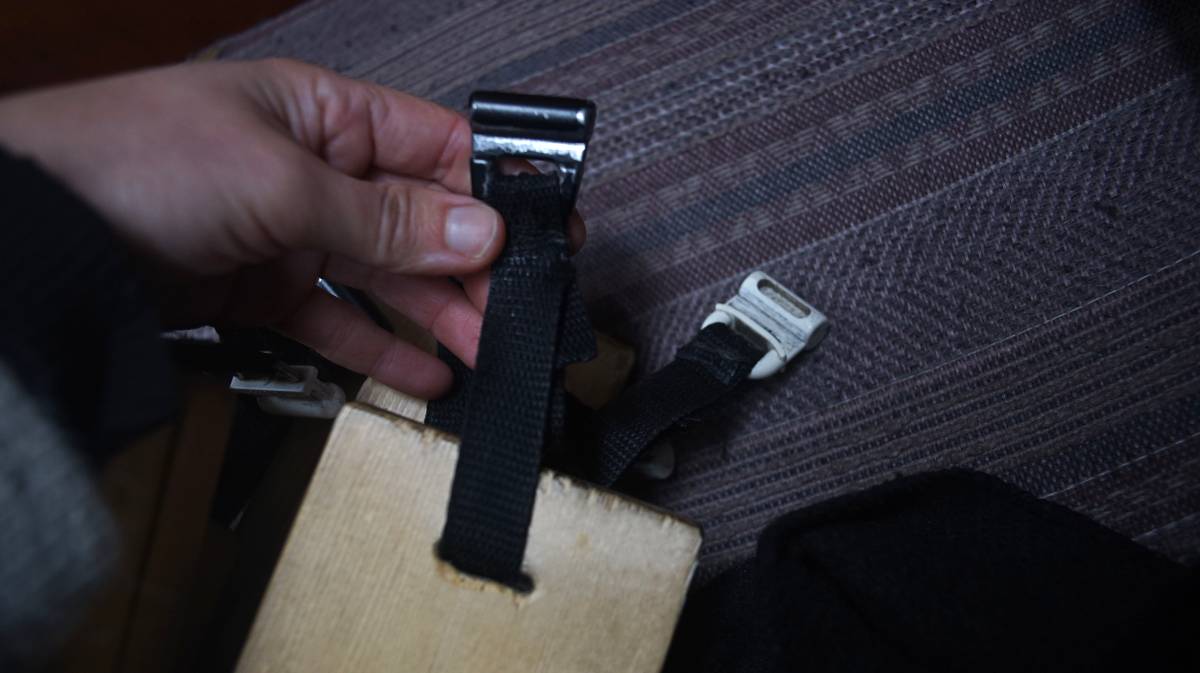 We bore long and narrow gaps on either side of each slat of wood, wide enough to accomodate a 20 mm (0.7 in) wide strip of nylon webbing. We passed the webbing through the gap, then through a nylon slide, and closed the loop by stitching the two ends of the webbing together.