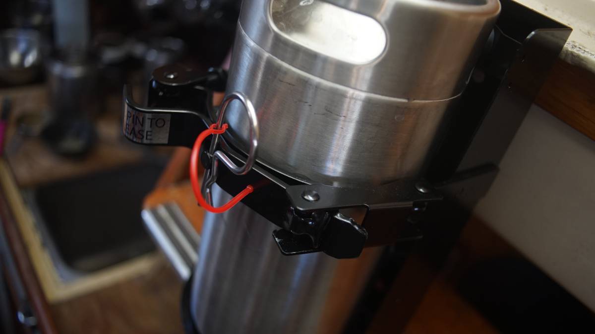 On a boat, keeping things secured is crucial, especially high-pressure items. We visited a local fire and safety equipment store, and asked if they sold brackets that could fit our keg. They sold us a heavy-duty bracket typically installed in moving vehicles. The item wasn't on their sell list, but he gave us a very fair price for it. We looked at the price of the bracket online afterward, it is typically sold for 90$CAD, we got it for 50$CAD.