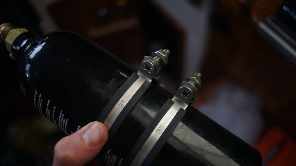 The paintball tanks are lighter, and easier to secure than the keg. We got some stainless steel loop hose clamps, and drilled a hole in the center of each clap so we could bolt it to the wall. We drilled holes to afix the clamps to the wall so we would never have to remove them, so that in turn we can secure the tank by slipping it into the clamp loops and tightening them with a bolt and nut. The rubber lining will ensure that it doesn't accidently slip out (should we experience another wave event, see north pacific ocean for details).