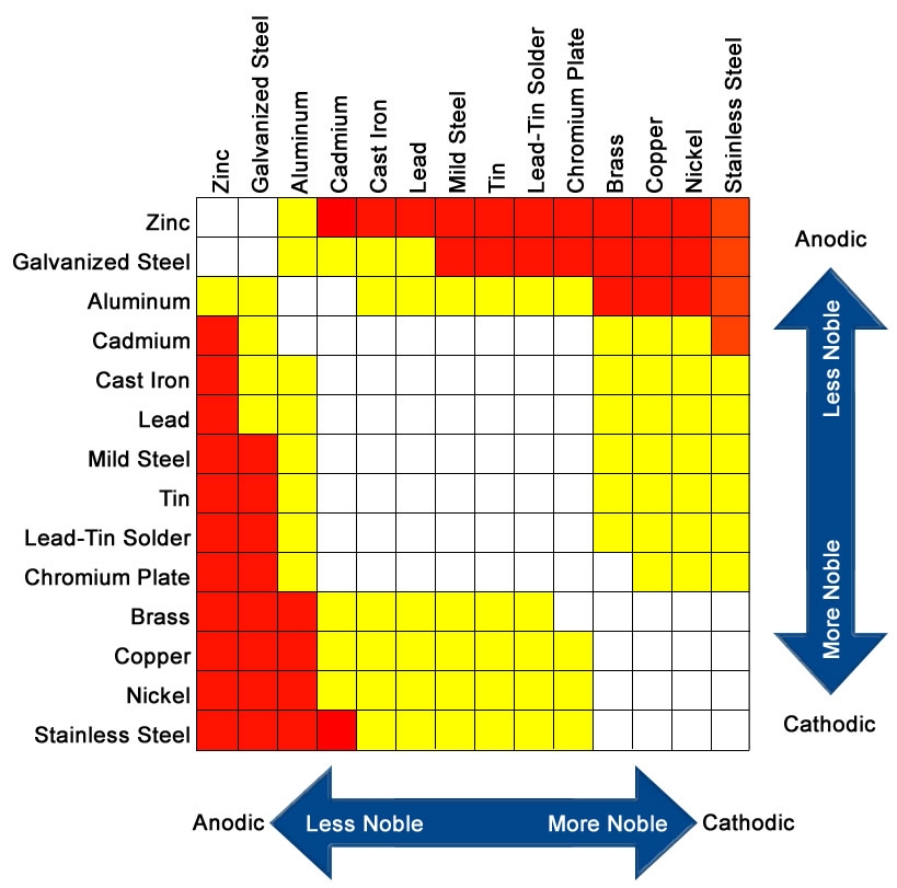 When selecting hardware aim for metals that are white(safe) in the following chart, do not mix metals intersecting at red(very problematic) or yellow(problematic).