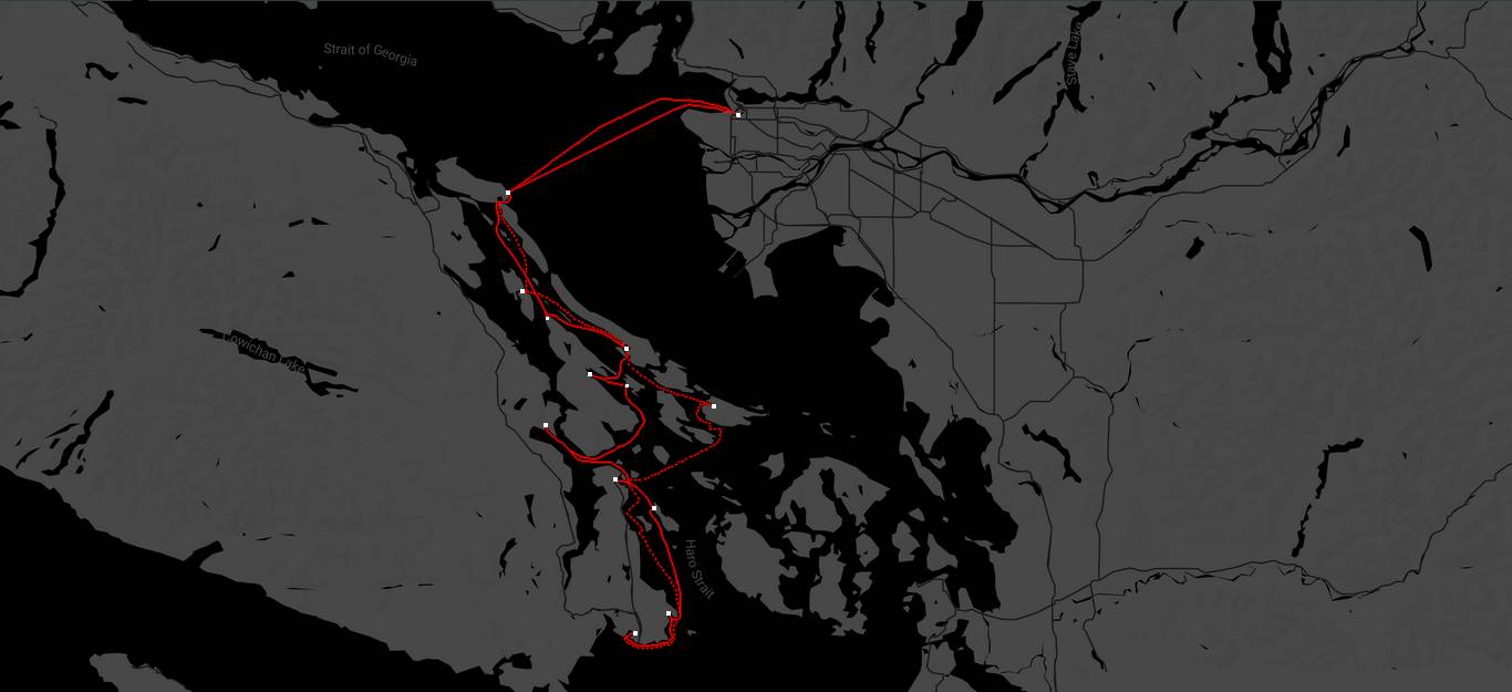 Since 2020 we've spent our winters on the Victoria docks, and summers cruising in the Salish Sea. Dotted lines indicate the return trip, with some overlap with the starting routes.