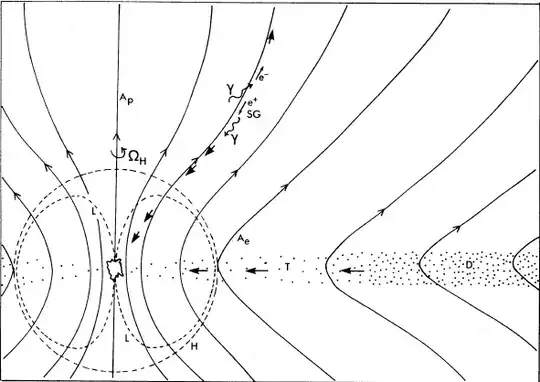 Unfortunately this description does not seem clear to me (although Thorne generally is excellent in explaining things throughout the book). To be specific, I cannot get a picture of the gas "sliding down" its magnetic field lines through the event horizon, while making the magnetic field "stick out" of the horizon at the same time. And here Thorne did not seem to point to any original research papers for further study.