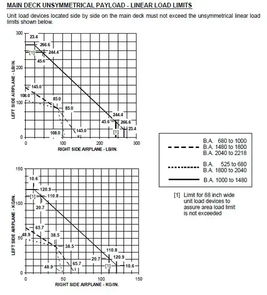 Widebody aircraft that can accommodate two rows of ULDs on the main deck have the option of carrying more weight in one container if the container laterally next it is given a lower limit. I know of one operator that didn't want to contend with the limit of, say, the position on the left being higher than the position on the right, and chose to forego the flexibility of unsymmetrical limits. An unsymmetrical limit graphs is below: