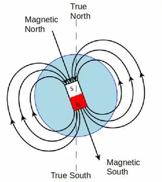 True geodetic north usually differs from magnetic north (the direction a compass points toward the magnetic north pole), and from grid north (the direction northwards along the grid lines of a map projection).