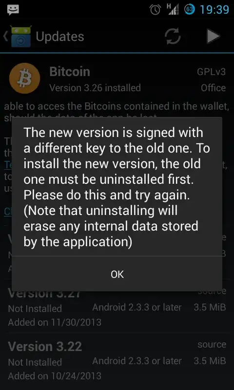 F-Droid is offering an update to Bitcoin Wallet, but when I try to update, the following message is shown. I haven't found any official news from the author about this key change. What should I do?