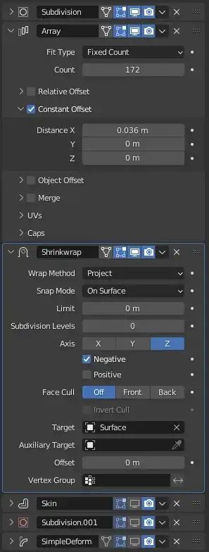 However, rather than doing that, you can make a mesh line, subdivide heavily, shrinkwrap on that surface when it's flat (so you can just project down on negative Z), duplicate with an array modifier and then bend. You can control the thickness of the skin modifier by modifying the mesh line (select all, CtrlA