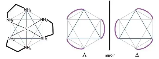 Look at the purple loop (en) on upper left hand side structure. Now, if you rotate the whole molecule ${90^o}$ clockwise around an axis going through top $\ce {NH2}$- $\ce {Ni}$-bottom $\ce {NH2}$, you will get that loop overlapping on similar loop on the mirror image. But, now look what happens to the other two loops? They are not overlapping on other two loops on mirror image. For example, the purple loop on bottom of left hand side structure will move to back side of the same side (it would be ${180^o}$ far from similar loop in the mirror image). Thus this molecule would not superimpose with its mirror image.