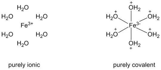 As commented above 'ionic' structures are not in accord with the chemical properties of coordination compounds. However, there are also a number of objections to the covalent description. The charge distribution is such that the iron(III) centre bears a three minus charge, whereas the oxygen atoms of the water ligands each bear a single positive charge. This would be unrealistic in view of the electronegativities of these elements ($\ce{Fe}$, 1.8; $\ce{O}$, 3.5), which predict that the $\ce{Fe-O}$ bond should be polarized in the sense $\ce{Fe^{\delta +}-O^{\delta -}}$. The problem was addressed by Pauling, who recognized that, in reality, it was not appropriate to describe most bonds as being purely 'ionic' or purely 'covalent'. He developed a description of the bonding between a metal and its ligands which included considerable ionic character in the metal-ligand bonds within a basically covalent regime. In order to determine the amount of ionic character within a given metal-ligand bond, Pauling framed his electroneutrality principle. In this, he opined that the actual distribution of charges within a molecule is such that charges on any single atom are within the range -1 to +1. It can be seen how this works by reconsidering the ion $\ce{[Fe(H2O)6]^{3+}}$. An ionic description results in a +3 charge on the metal centre, whilst a covalent description gives the metal a -3 charge. Now the electroneutrality principle suggests that the ideal charge on the metal centre is zero. That would be achieved if the iron centre gains a total of three electrons from the six oxygen donor atoms; in other words, if each oxygen loses one half of an electron rather than the whole electron which the fully covalent model demands. Pauling describes this situation as 50% covalent (or 50% ionic).