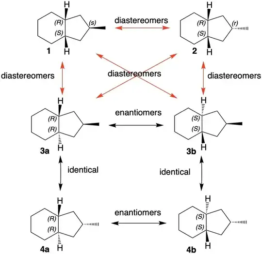 Hydrindanes 3a(4a) and 3b(4b) have a trans ring juncture and they are enantiomers of each other. The carbon bearing the methyl group is both non-stereogenic and achirotopic. Hence, the lack of a stereochemical descriptor.