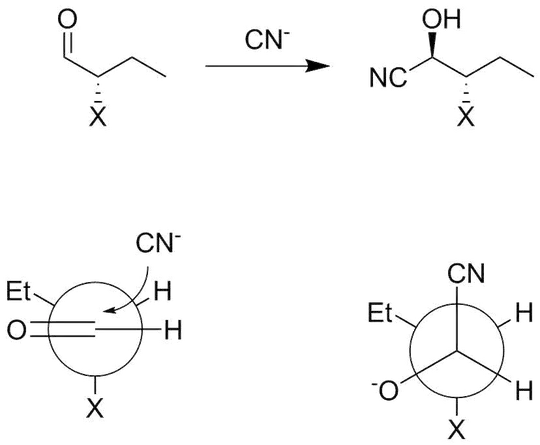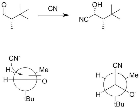 One method to predict stereoinduction in asymmetric reactions is the Felkin-Anh model (derived from the more basic Cram model) that applies to nucleophile attacks on α-chiral aldehydes. In a simple case such as (S)-2,3,3-trimethylbutanal, assignment of large, medium and small residues is trivial and we predict nucleophile attack as indicated in scheme 1 to generate (2R,3S)-2-hydroxy-3,4,4-trimethylpentanenitrile.
