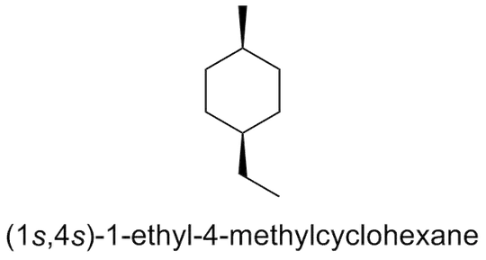 Therefore, this rule also applies to (1s,4s)-1-ethyl-4-methylcyclohexane, which is given in the question, and its isomer (1r,4r)-1-ethyl-4-methylcyclohexane. (The examples mentioned in the Blue Book include the similar compounds (1s,4s)-cyclohexane-1,4-diol, (1r,4r)-cyclohexane-1,4-diol, and (1r,4r)-4-chloro-4-methylcyclohexan-1-ol.)
