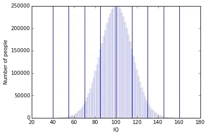 Simulated distribution of IQ for a population of 7 million (1/1000 the global population). Vertical lines indicate standard deviations (15 points). In this simulation, 238 people have IQs > 160.