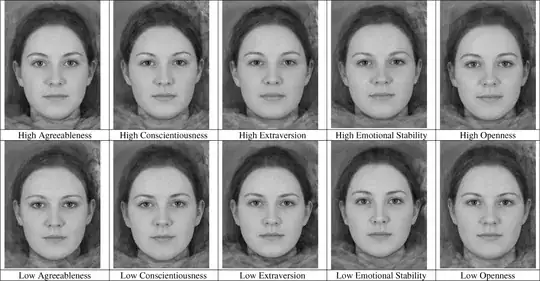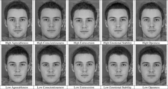 Also, the Big Five differ in observability (Penton-Voak, Pound, Little, & Perrett, 2006). Participants were asked to rate the Big 5 aspects of the personality of strangers. There was a strong agreement between these ratings and the results of a personality test the depicted persons had filled in (reliability calculated as Cronbach's $\alpha=.70\text{–}.89$ for all dimensions, only male conscientiousness was $.63)$. Similar results were found with composite images.