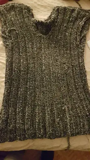 I'm in the process of knitting a jumper 'freehand', i.e. without a pattern. I started from the bottom edge, knit in the round up to the armholes, split the knitting, continued to the top of the shoulders, and then did a three-needle bind off to join them.