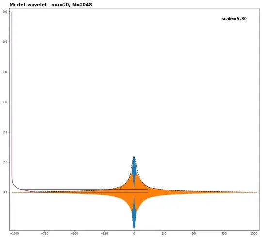 Now the time-domain wavelet fares fine, while freq-domain is clearly troubled: half (or more) of it is entirely missing! We have the "trimmed bell" problem, contrary to "insufficiently sampled bell" for high scale case. The center frequency distinction becomes critical here; peak will always equal $\pi$, while energy will lie to its left. Investigating the behavior of the $\sigma_\omega$ integral, I found the energy variant to yield stabler and at times more sensible results, but depending on application, peak can also be used (with due re-interpreting of $\sigma_\omega$).