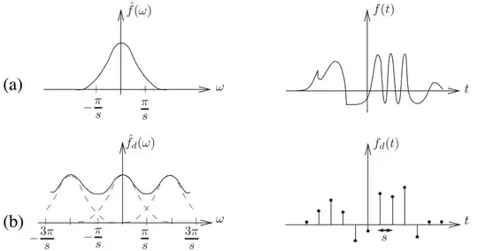 \hat f_d (\omega) = \frac{1}{s}\sum_{k=-\infty}^{\infty} \hat f \left( \omega - \frac{2\pi}{s}k \right) \tag{3}
