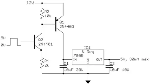 For an Arduino project I needed both 5V and 12V voltages. Specifically, for an IC I needed 5V and I needed to be able to switch it on and off using an Arduino PIN. Since the current drawn by the IC might exceed what can be drawn from the Atmega328 pins, and since I couldn't tolerate any less than 5V, I tried using the following circuit.