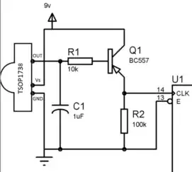 I understand that the 1 microfarad capacitor discharges and charges after an IR signal is received (e.g., after a button on a TV remote control is pressed). And the purpose of the mentioned capacitor is for the IC to count the IR pulses as 1 pulse. So after the last pulse, the IC's pin 14 should receive a "HIGH" input. But how does the charging and discharging of the capacitor work with the PNP transistor in this circuit? How does the IC's pin 14 receive a positive voltage?