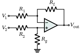 \$ V_{out} = \dfrac{R_f}{R_1} \cdot (V_2 -V_1) \$