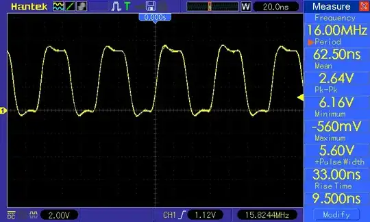 Now I have an Atmega328P MCU running from an external quartz at 16 MHz, without any code it it (chip erased by usbasp), only CKOUT fuse bit is set. So I supposed to see a square wave at PB0 pin, but my scope shows it quite distorted: