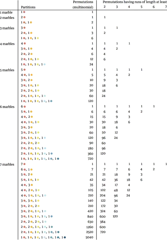 We observe that these three coefficients correspond to the configurations $(2,2), (2,1,1)$ and $(1,1,1,1)$ of marbles and derive in accordance with OPs example in the column runs of length at least 2: