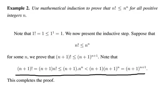 The last line uses the induction hypothesis i.e. $n!\leq n^n$ – Kushal Bhuyan Mar 14 '17 at 05:16