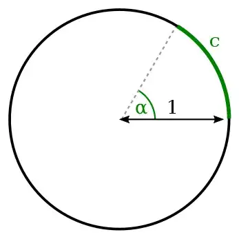 Look at the following picture. It is a circle of radius $r=1$ and there is an angle $\alpha$ that cuts out an arc $c$ from the circumference of the circle.