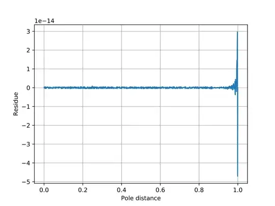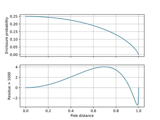 Therefore I could write $$P(x)=\frac14-\frac3{\pi^2}\sum_{n=1}^\infty\frac{x^{2n}}{2n^2}$$ Thus was revealed the series expansion of the dilogarithm, the simplest expression for $P(x)$ and perhaps the most elegant equation I have encountered: $$\bbox[5px,border:1px solid black]{P(x)=\frac14-\frac3{2\pi^2}\operatorname{Li}_2(x^2)}$$ I confirmed the correctness of this expression by comparing its values to my precomputed samples of $P(x)$, finding nothing but round-off error in the latter: