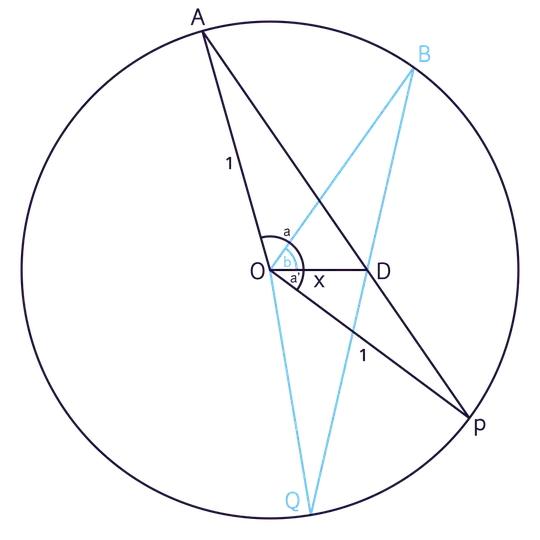 Here $O$ is the origin and the arguments of $A$ and $B$ when treated as complex numbers are $a$ and $b$, lying in $[0,\pi]$ and $[0,a]$ respectively. The argument of the triangle's third point (not shown) lies in $[-\pi,0]$ and has to be between $P$ and $Q$ for the triangle to contain the fixed point $D$ at $(x,0)$. The first term in the integrand $\sin^{-1}\frac{x\sin b}{\sqrt{1+x^2-2x\cos b}}$ is $\angle DOQ$, the second term $\angle DOP$.