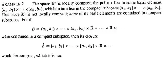 My understanding: To derive a contradiction for the local compactness of $\mathbb{R}$, the proof uses the fact that a closed set of a compact space is compact. Furthermore, if X is a compact space in Y and Y is a compact space in Z, then X is a compact space in Z. If we show that X (in this case, the closure of B) is not compact in Z ($\mathbb{R}^{\omega}$), then we have proven that $\mathbb{R}^{\omega}$ is not locally compact. This part follows from the fact that $\mathbb{R}^{\omega}$ is not compact.
