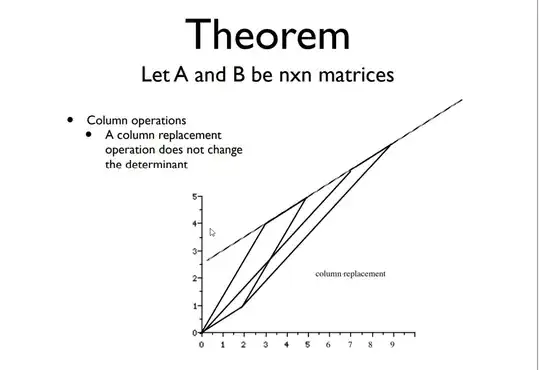 The second because it stops referring to the determinant as the space enclosed by the columns of the matrix, an instead refers to it as the amount by which space gets scaled by when we use $A$ as a transformation. Although the connection seems to be obvious to everyone, I'm still having a little bit of a hard time grasping why those two (the space enclosed by the columns of $A$ and the amount by which $A$ space scales by when we use it as a transformation on a whole bunch of vectors) are the same.