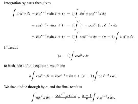 $$\int \cos^n x ~dx=\cos^{n-1}x~\sin~x+(n-1)\int \cos^{n-2}x~dx-(n-1)\int \cos^n x~dx\qquad . .. . .. (1)$$ If you add both side by $$(n-1)\int \cos^n x~dx$$then $(1)$ becomes $$\int \cos^n x ~dx+(n-1)\int \cos^n x~dx=\cos^{n-1}x~\sin~x+(n-1)\int \cos^{n-2}x~dx-(n-1)\int \cos^n x~dx+(n-1)\int \cos^n x~dx$$ $$\implies (1+n-1)\int \cos^n x ~dx=\cos^{n-1}x~\sin~x+(n-1)\int \cos^{n-2}x~dx+\{(n-1)-(n-1)\}\int \cos^n x~dx$$ $$\implies n\int \cos^n x ~dx=\cos^{n-1}x~\sin~x+(n-1)\int \cos^{n-2}x~dx$$
