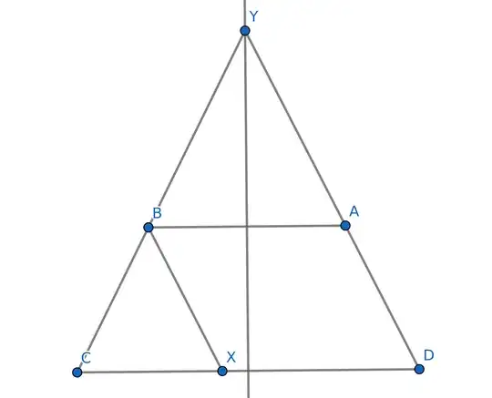 Again let $D=C+t(A-B)$ and the perpendicular bisector of $AB$ be $\mathbf{n}\cdot\left(\mathbf{x}-\frac{A+B}{2}\right)=0$ where $\mathbf{n}=B-A$. Then, for symmetry relative to the perpendicular bisector, we get $$\mathbf{n}\cdot\left(A-\frac{A+B}{2}\right)=- \mathbf{n}\cdot\left(B-\frac{A+B}{2}\right),\\ \mathbf{n}\cdot\left(C-\frac{A+B}{2}\right)=- \mathbf{n}\cdot\left(D-\frac{A+B}{2}\right)$$ plugging $D$ into the latter equation we get a linear with respect to $t$, solving we get $t=\frac{3}{2}$ again.