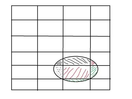 Now you may have an objection here. That last transformation changed all the areas, and those are what you were trying to find. This is true, but the change is proportional: all areas are scaled by a factor of $\dfrac1{ab}$. In particular, the original ellipse has area $\pi ab$, while the transformed ellipse is a unit circle of area $\pi$. Once you calculate the areas in this system, you can get the corrsponding areas in grid coordinates by multiplying by $ab$.