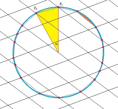 The dark blue lines connecting the intersection points are the chords. There is one chord for each sector formed by the intersections. The chord and the two radii form a triangle whose area is $\frac 12\sin\alpha$, which makes the area of the sliver (the region between the chord and the circular arc, such as the one for a different sector I colored orange - there is a name for it, but I don't recall) to be $$\frac \alpha 2 - \frac 12\sin\alpha = \frac 12\left(\alpha - \sin\alpha\right)$$