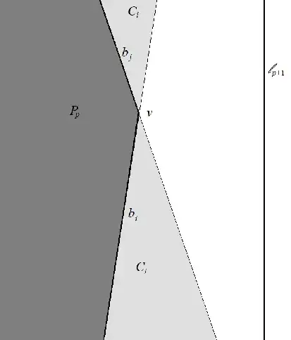 Now we note a couple things about the Sets $P_k = \bigcap_{i=1}^k C_i$, for any $k \ge 2$. Because the intersection of convex sets is also convex, each $P_k$ is convex. Further, if $P_{k-1}$ is a polygon and $P_k \ne \varnothing$, then $P_k = C_k \cap P_{k-1}$ is also a polygon. This is because the intersection just cuts off from $P_{k-1}$ the portions that extend beyond $C_k$'s two boundary lines. And since $P_2$ is a polygon, by induction, so are all the $P_k$ for $k > 2$.