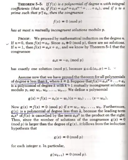 • Ok, I think I get this now. Basically, we constructed a $g(x)$ of degree $k-1$ which has at least $k$ solutions to $g(x)=0$ and therefore at least $k$ solutions to $g(x) \equiv 0 \bmod p$. For this to NOT yield a contradiction, we must have a situation whereby $g(x)$ is ALWAYS congruent to $0$ mod p for every integer $x$....the author on the next page then uses this to lead to a contradiction of the assumption that a degree $k$ polynomial can have $k+1$ mutually incongruent solutions mod p. – HFM Sep 29 '21 at 22:20