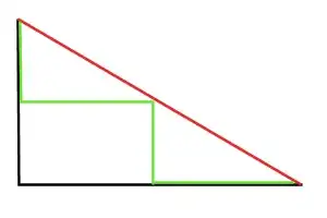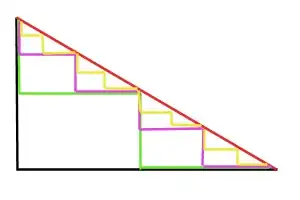 Now obviously, the yellow path is still as long as the black path from the beginning, it's just $8*a/8+8*b/8=a+b$. But if we do this segmentation again and again, we approximate the red line - without making the way any shorter. Why is this so?