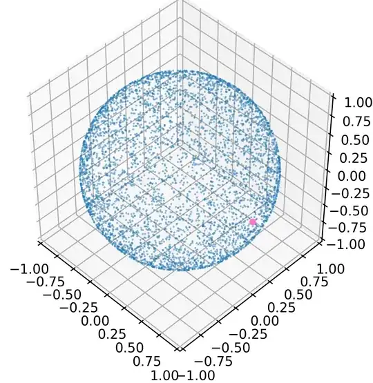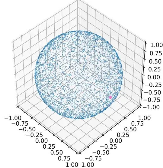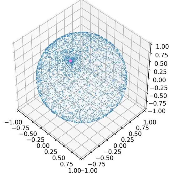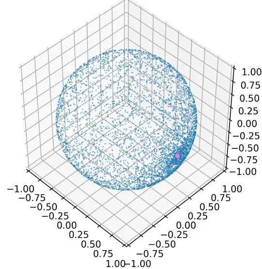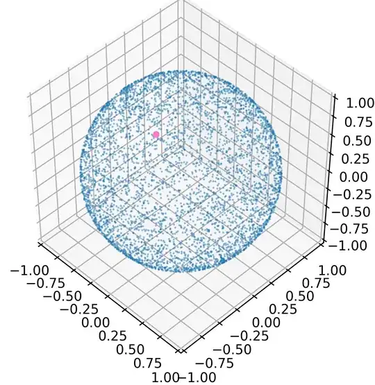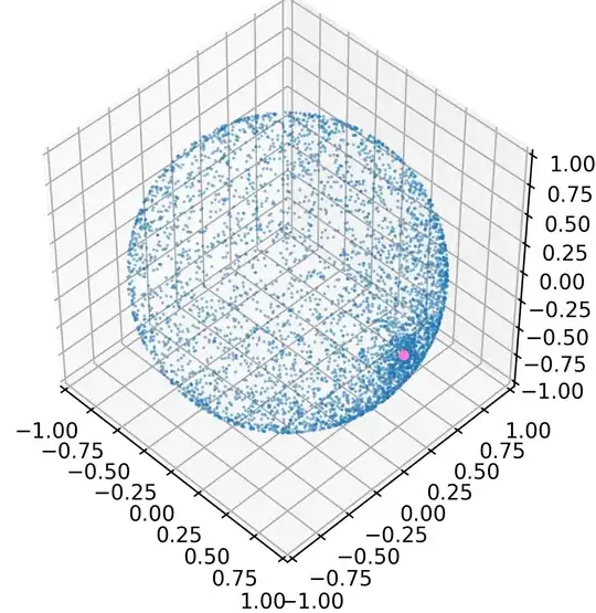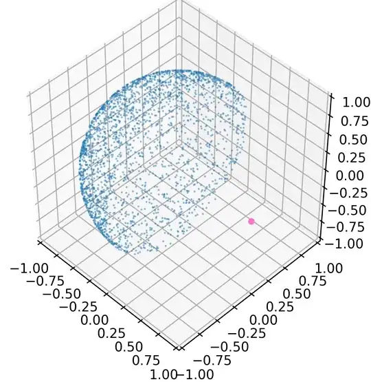 The pink point denotes "initial" point. The blue points are the result of rotating the initial point using 5000 randomly generated 3x3 rotation matrices.