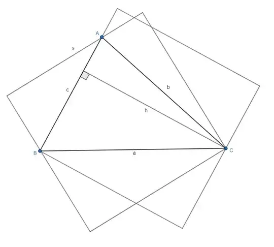 In the figure there are particular values to verify the size of concerned squares with $(a,b,c)=(10,8,7)$ and the literal calculation is similar but more difficult to manipulate.