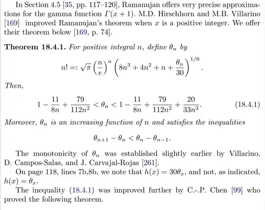 $$\fbox{$n!=\sqrt{\pi} (\frac{n}{e})^n \sqrt[6]{8n^3+4n^2+n+x(n)}$}\tag1$$