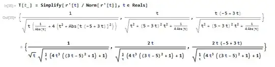 Norm[]altogether:Simplify[T'[t]/Sqrt[T'[t].T'[t]]]. You might be interested in looking atFrenetSerretSystem[], too. – J. M.'s missing motivation Oct 07 '16 at 02:11Abs. – krourou2 Oct 07 '16 at 02:17Simplify[r'[t]/Sqrt[r'[t].r'[t]]]. Make sure to clear all variables before trying all of these. – J. M.'s missing motivation Oct 07 '16 at 02:19