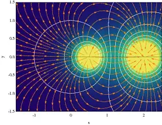 What I am trying to achieve is a sophisticated plot, with the cylinder at the origin, where the equipotential lines and the electric field lines will be plotted. I found something like that on the net (specifically the page "Gradient field plots in Mathematica"), but I don't know how to modify it...