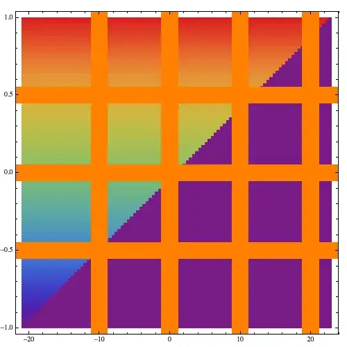 DataRangeoption? This produces your basic plot:Show[ ArrayPlot[dataP[100, 100], ImageSize -> {500, 500}, ColorFunction -> "Rainbow", DataReversed -> True, DataRange -> {{-21, 23}, {-1, 1}}], FrameTicks -> Automatic, AspectRatio -> 1]Grid lines can be added á la rm -rf's answer. – Michael E2 Jul 03 '13 at 22:56ArrayPlothas bugs. – Johu Jul 13 '14 at 16:55