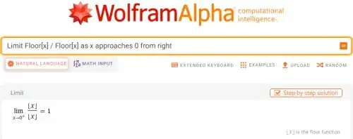 In[12]:= a/a Out[12]= 1– Greg Hurst Jan 08 '24 at 17:10Floor[x]/Floor[x]to1before even the Limit gets a chance to look at it. It is as if you wroteLimit[1, x -> 0, Direction -> "FromAbove"]which ofcourse is1– Nasser Jan 08 '24 at 17:12Limit[ConditionalExpression[1, Floor[x] != 0], x -> 0, Direction -> "FromAbove"]. I'm not sure how to get that to happen, though. At least not in an easy way. (Redefine division or power to include a domain condition is a potential approach. But redefining system functions messes up internal algorithms, so not "easy" imo.) – Goofy Jan 08 '24 at 17:53
