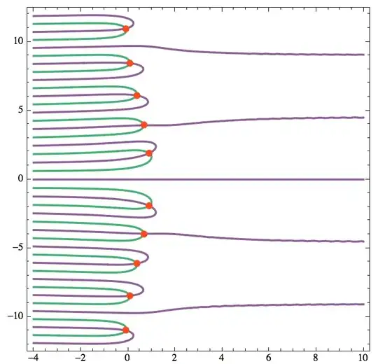 Now let's plot the zeros, together with the contours of zero real and imaginary parts: