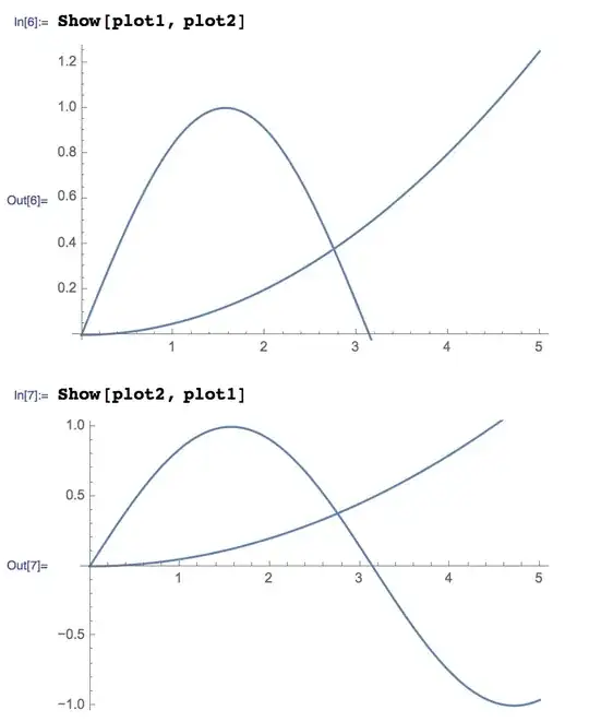 Showtakes options from the first argument which is different for those cases. – Kuba Mar 22 '14 at 22:16Show[g1, g2,...]orShow[{g1, g2,...}]concatenates the graphics primitives in thegi, effectively overlaying the graphics." And: "The lists of non-default options in thegiare concatenated." – Michael E2 Mar 22 '14 at 23:39Showdoes not care about options ingiother thang1(AFAIK). – Alexey Popkov Mar 23 '14 at 01:33p3 = Show[ p1 = Plot[x^2, {x, 0, 2}], p2 = Plot[2 Sin[x], {x, 0, 3}, ImageMargins -> 100] ]; AbsoluteOptions[p1]The first occurrence of an option overrides later ones, which are deleted.ImageMarginsis set to0.inp1, which would causeImageMargins -> 100to be ignored, IF that is how it works. In effect, then, what you say is true, too, since the first plot seems to set every possible option, or at least the documented ones. In any case, the doc. is at least misleading. – Michael E2 Mar 23 '14 at 01:55Show: according to the citation, it must ignore default option values in thegiwhen concatenating options. – Alexey Popkov Mar 23 '14 at 02:00Show. It is worth to fill a bug report on this issue. – Alexey Popkov Mar 23 '14 at 02:46