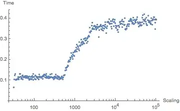 Sin/Cos. – Szabolcs May 16 '14 at 17:56.066on my computer. – Jens May 16 '14 at 18:20$TimeUnit(it's typically incorrect). – Szabolcs May 16 '14 at 18:58Exp[I x]slows down forAbs[x] >= 512.The transition is clearer like this:w = ConstantArray[N[I], {5000000}]; t = Table[{n, Timing[Exp[n w]][[1]]}, {n, 510, 514, 0.1}]– Simon Woods May 17 '14 at 13:14nExpofExpsimilar to my answer to Slow exponential evaluation over lists, but with_Complexinstead of_RealinsideCompileI only get the long timings independent ofScaling. Plot – Karsten7 Mar 18 '15 at 02:18