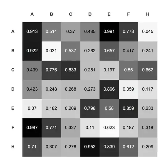 I'm trying to format a raster-style table with row and column headings and in which each cell is shaded according to the value in the cell, and the value of the cell is displayed in as text in a contrasting shade, for example